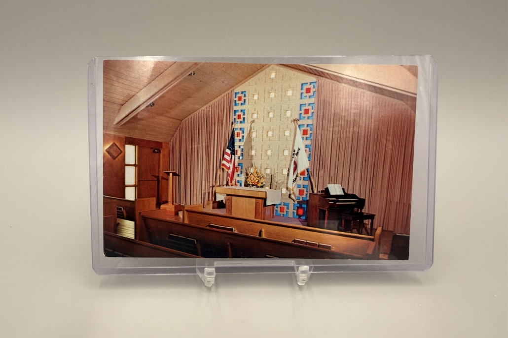Text auf der Rückseite: The interior of the Chapel reflects the meaning of its cornerstone inscription – „To each his own, a place of prayer and meditation“. All labor necessary to build the chapel was donated by „SOLAR“ employees. It was started in 1952 and dedicated in 1955. Weekly services visiting clergymen of the community of all faiths, are hold during lunch hours.